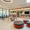 Über den Parkplatz kommend gelangen Badbesucher in das helle großzügige Foyer. Der architektonische Pathos "Erlebnis- und Sportpark" schlägt sich auch auf die Außenraumgestaltung nieder. Technische Anlagen verkleidet und funktional strukturiert laden zu sportlichen Aktivitäten ein. Die offene Gestaltung wird im Foyer über direkte Einblicke in die Beckenlandschaft gefördert. Diese wiederrum kommuniziert über terrassierte Liegebereiche mit den angrenzenden Außenanlagen.