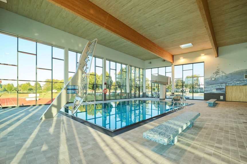 Im Zentrum eines Erlebnis und Sportparks gelegen fügt sich das geplante Ganzjahresbad bereits inhaltlich in seinen Kontext. Die Architektur wird durch eine ortsprägende offene Geste bestimmt.