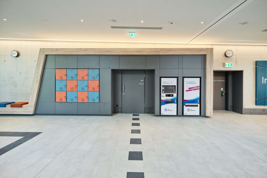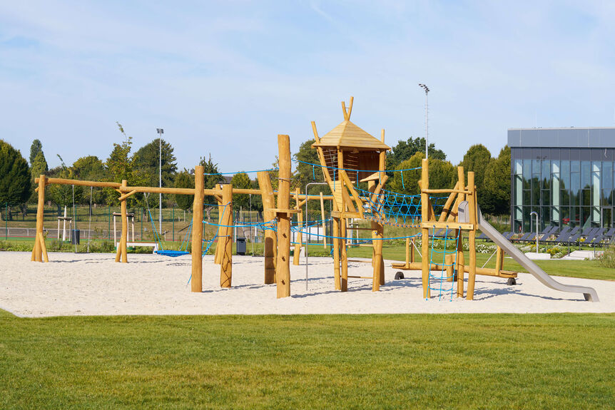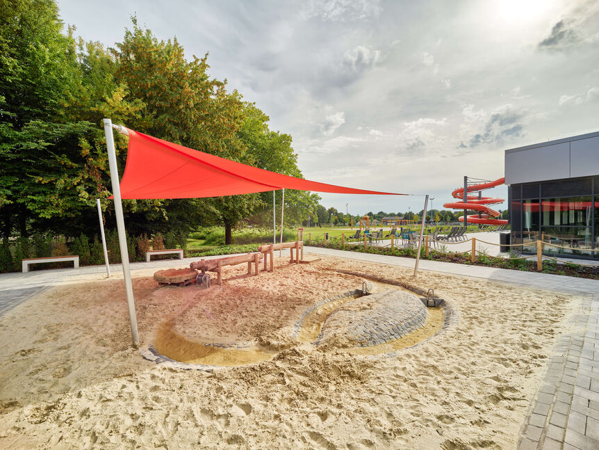 Über den Parkplatz kommend gelangen Badbesucher in das helle großzügige Foyer. Der architektonische Pathos "Erlebnis- und Sportpark" schlägt sich auch auf die Außenraumgestaltung nieder. Technische Anlagen verkleidet und funktional strukturiert laden zu sportlichen Aktivitäten ein. Die offene Gestaltung wird im Foyer über direkte Einblicke in die Beckenlandschaft gefördert. Diese wiederrum kommuniziert über terrassierte Liegebereiche mit den angrenzenden Außenanlagen.