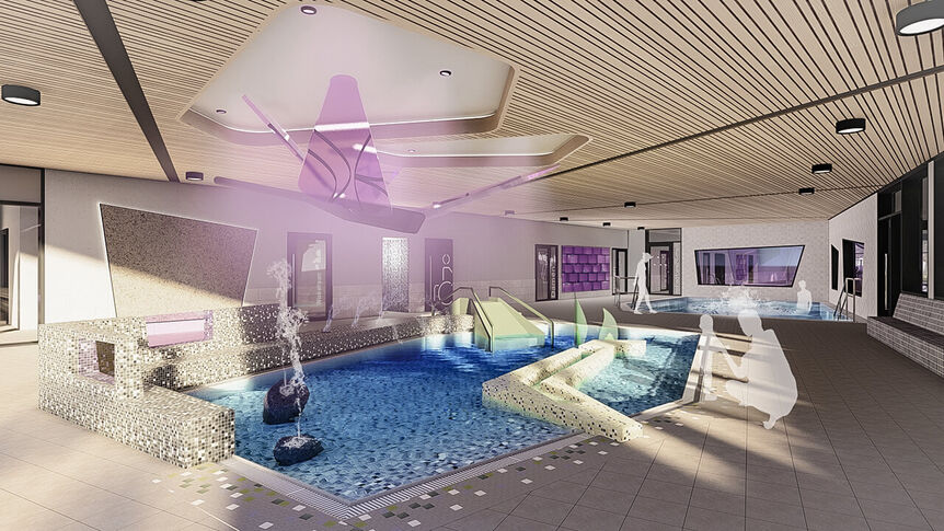 Das Hallenbad wird ein vielseitiges Angebot bieten, das sowohl sportliche Aktivitäten als auch Freizeitgestaltung ermöglicht. Es wird ein Lehrschwimmbecken, ein Planschbecken sowie ein Sportbecken mit Sprunganlage umfassen. Zusätzlich ist eine kleine Badgastronomie sowie Räumlichkeiten für Personal und Verwaltung vorgesehen.