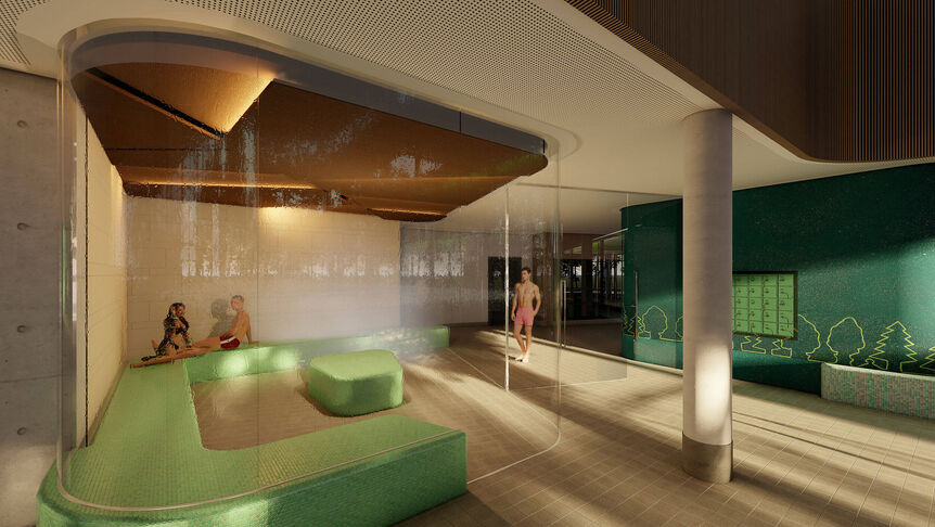 - Die architektonischen Formensprache des neuen Waldbades nimmt eine Grunderfahrung der Badegäste auf: Beim Wandeln durch die Bäume muss der Besucher seinen Weg immer wieder neu anpassen. Daraus ergibt sich ein natürlicher Bewegungsrhythmus gerader und geschwungener Laufwege. Diese natürliche Dynamik greift die Architektur des neuen Waldbades in seiner Formensprache auf. Konisch zulaufende Formen, abgerundete Ecken und natürliche Materialien führen dieses dynamische Raumgefühl eines Waldes in der Architektur fort.