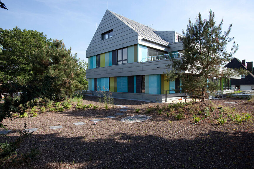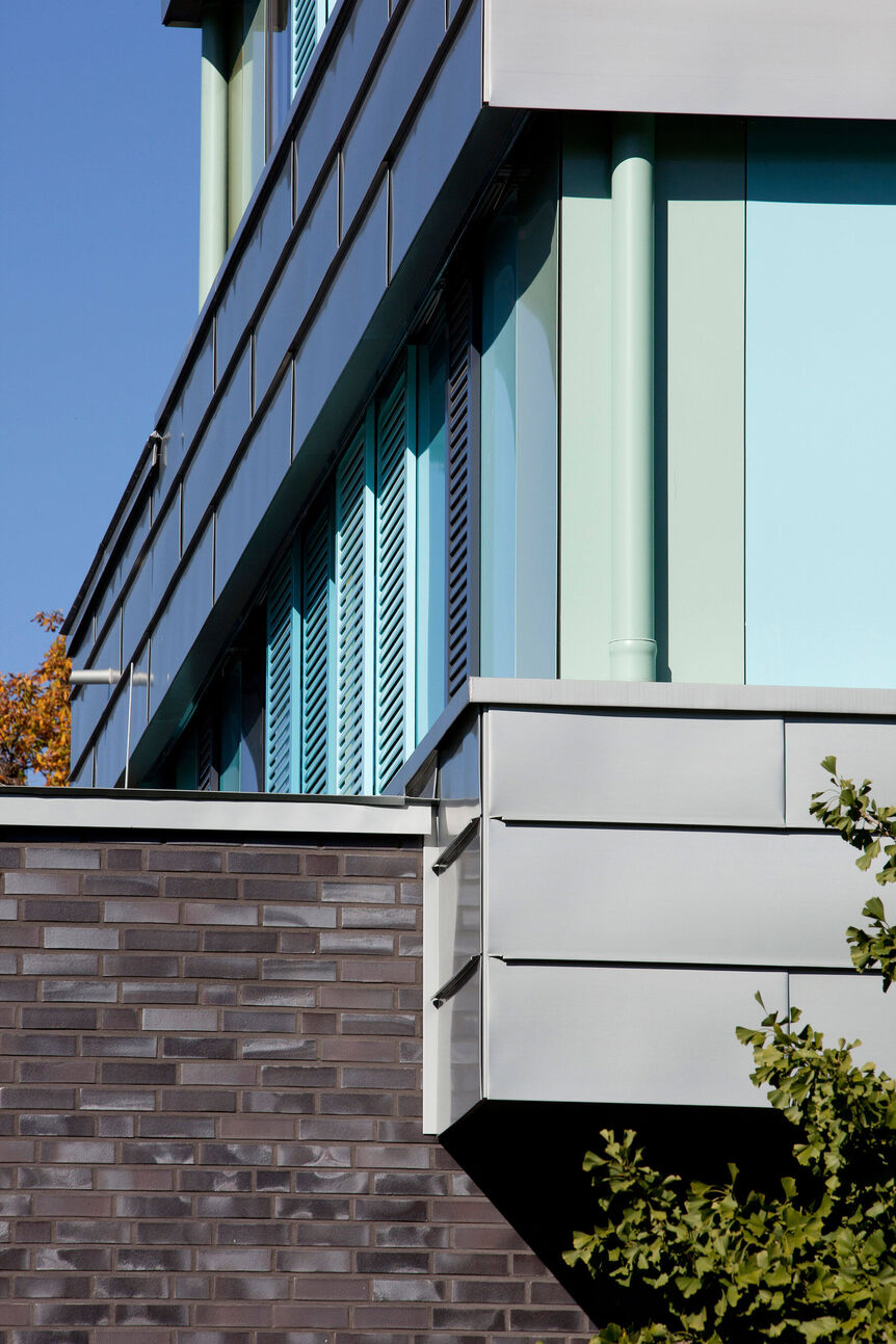 Als Bindeglied zwischen alter, denkmalgeschützter Bebauung auf der einen Seite und dem modernen, lichtdurchfluteten Architekturbüro auf der anderen, ist dieser neue Baukörper entstanden. Er vereinigt Materialien, die den Charme der alten Villa und die Sachlichkeit des modernen Bürogebäudes elegant verbinden.