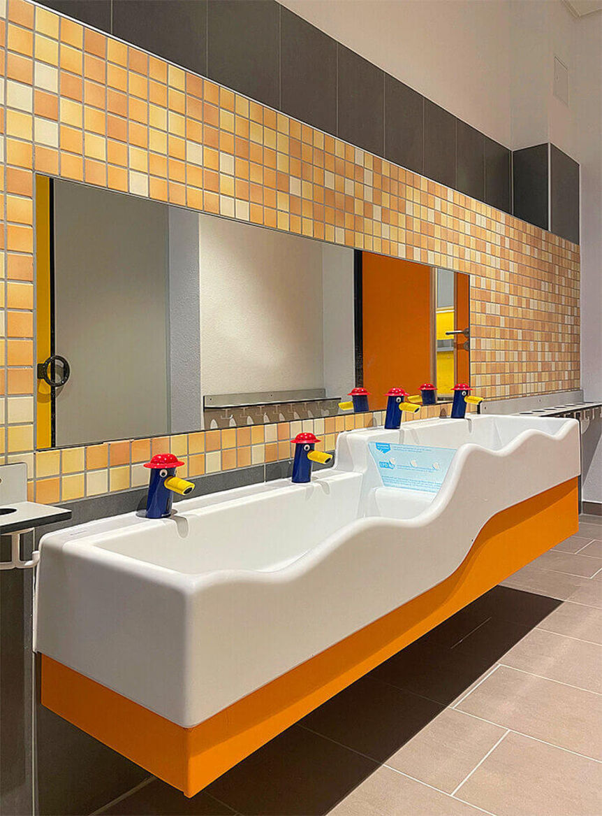 Hier handelt es sich um den Neubau einer 4-gruppigen Kindertagesstätte am Standort des ehemaligen Paul-Lemmertz-Bades. Die Kita entsteht parallel zum Ersatzneubau des Hallenbades auf dem gleichen Baufeld. Das für den Bau der Kita verbleibende Restgrundstück entwickelt sich in seiner Längsachse in nordsüdlicher Richtung. Sämtliche Gruppenräume und Gruppennebenräume werden über Türanlagen barrierefrei an die Außenspielfläche angebunden. Über einen Vorplatz wird die Kita an den ca. 900m2 großen Freibereich im Westen erschlossen. Der Vorplatz kann somit großzügig sowohl für das Hallenbad wie auch als Außenspielbereich für die Kita-Kinder genutzt werden.