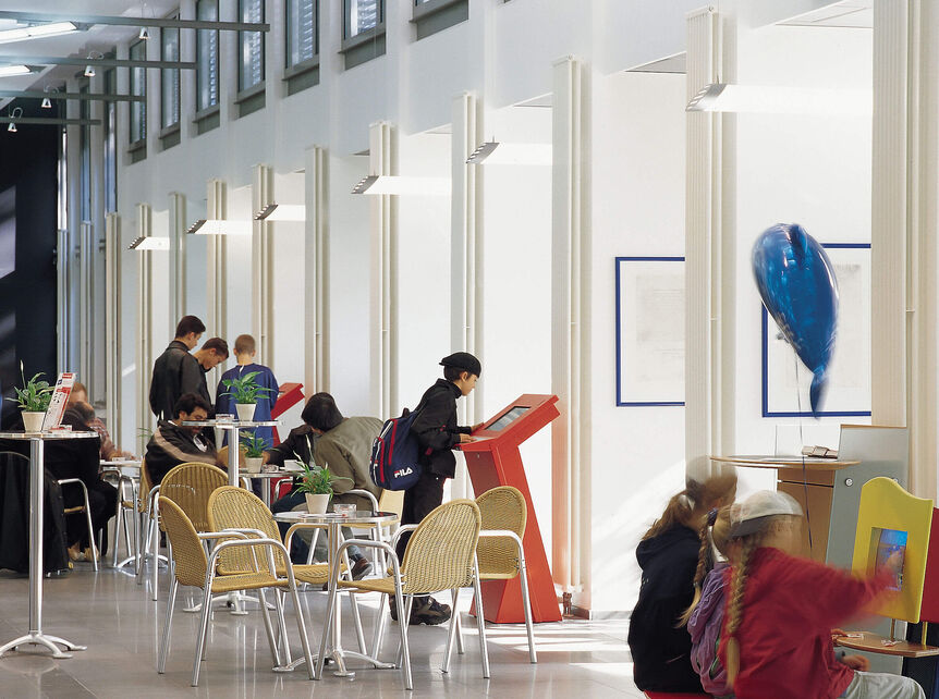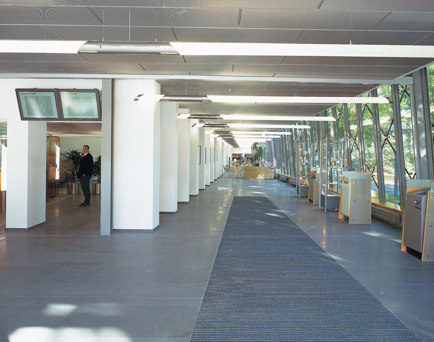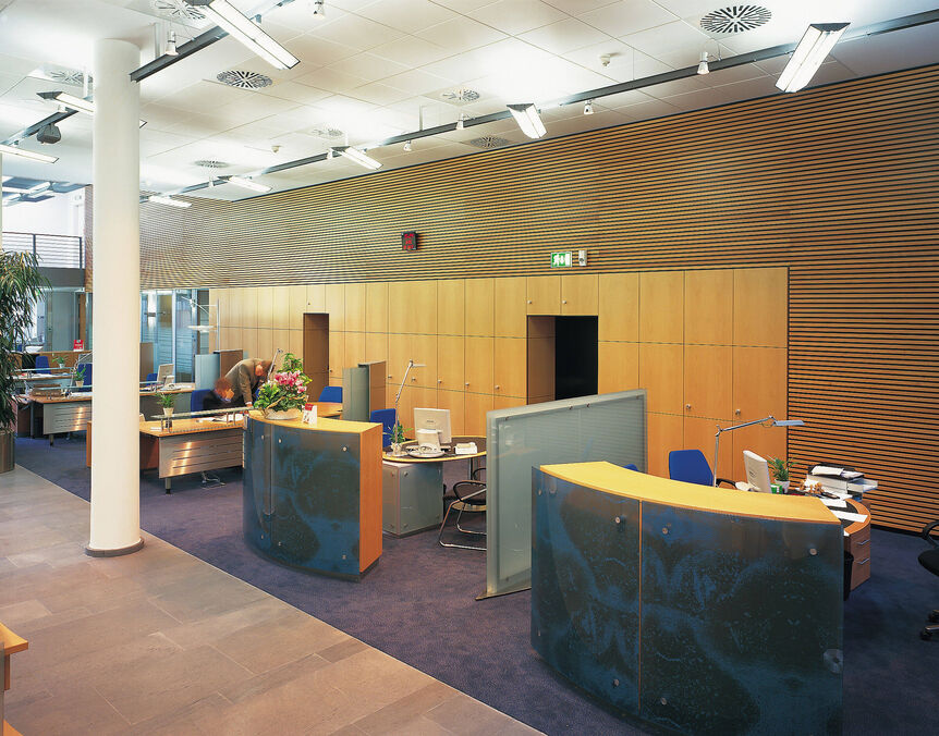 Die Hauptstelle der Sparkasse Hilden-Ratingen-Velbert sollte unter modernsten Gesichtspunkten aufgerüstet werden. Neben der Renovierung des Bankgebäudes aus den sechziger Jahren wurde mit einem Anbau für die Angliederung an die Fußgängerzone mit flexibel nutzbarem 24-Stunden-Bereich gesorgt. Die Kundenberatungshalle und der Anbau mit seiner geneigten Glasfassade sind ganz dem Erlebnis „Bank“ gewidmet.