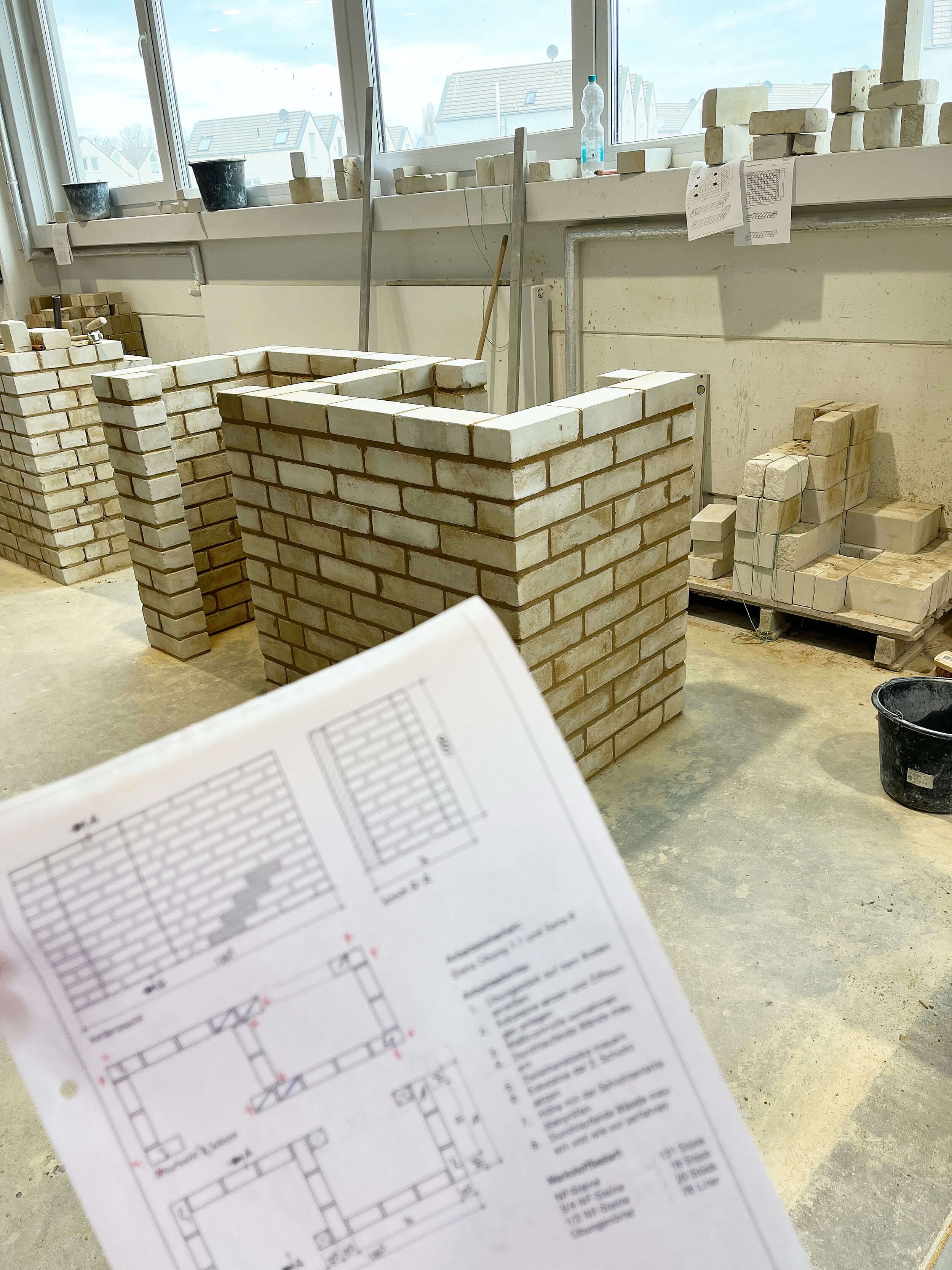 In der Zeit vom 05.02.2024 - 22.03.2024 durften wir gemeinsam sieben Wochen lang unglaublich viel im Ausbildungszentrum in Oberhausen lernen. Besonders spannend war unser Fokus auf das Mauern mit verschiedenen Verbänden. Ein Mauerverband ist die Art und Weise, wie Steine im Mauerwerk geschichtet sind, um die Lasten gleichmäßig zu verteilen und das Aussehen des Mauerwerks zu prägen. Anfangs waren die Arbeitsschmerzen in den Knien und der Muskelkater in den Händen und Armen eine Herausforderung, aber wir haben uns schnell eingearbeitet.